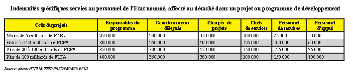 Les projets et programmes de développement sont mis en œuvre par une unité de gestion dont le responsable est le coordonnateur. Ce dernier est assisté par un coordonnateur délégué le cas échéant, des chargés de projets, un personnel technique, un personnel d’appui, un service administratif et financier, un service de contrôle externe, un service de suivi-évaluation. Dans ces projets et programmes de développement, travaillent 2 types de personnel. On y rencontre du personnel de l’Etat nommé, affecté ou détaché. Ce personnel conserve sa rémunération attachée à sa qualité d’agent de l’Etat. Mais, il lui est servi une indemnité spécifique mensuelle qui est fonction du budget global du projet (Cf. tableau 1). En se basant sur le décret, on observe qu’un coordonnateur d’un projet ayant un statut d’agent de l’Etat, en plus de son salaire d’agent de l’Etat, bénéficie d’une indemnité dont le montant varie entre 250.000 FCFA et 400.000 FCFA par mois.