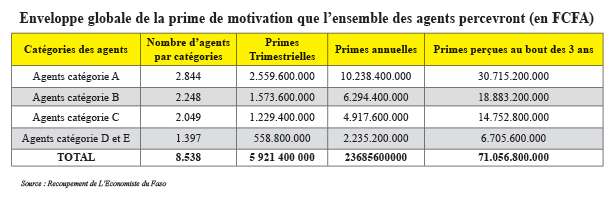 La prime annuelle de motivation de l’agent de catégorie C est fixée à 2.400.000 FCFA, soit 7.200.000 FCFA en 3 ans. Celle des agents des catégories D et E sont fixées à 1.600.000 FCFA l’année et 4.800.000 FCFA en 3 ans.