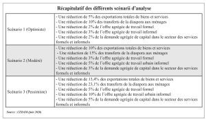 L’évaluation a formulé 3 scenarii dont la particularité est de simuler différents chocs en fonction de la vulnérabilité des secteurs de production à la pandémie. Le scénario 1, qualifié d’optimiste, prévoit que la durée de la pandémie n’excède pas 3 mois au niveau national comme au niveau mondial.