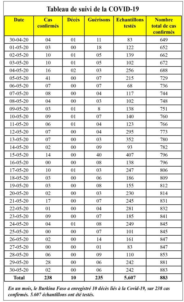 A ce niveau, les chiffres montrent une tendance à la baisse de ces transmissions communautaires depuis fin mars. Il y a plus de cas importés que de transmissions communautaires. Autre point à relever, les cas de transmissions communautaires recensés viennent des deux capitales du pays. Les autres foyers ont été maîtrisés. Le pays a enregistré 9 décès entre le 30 mars et le 30 mai 2020 pour 883 cas au total (confère tableau de suivi de la Covid-19).