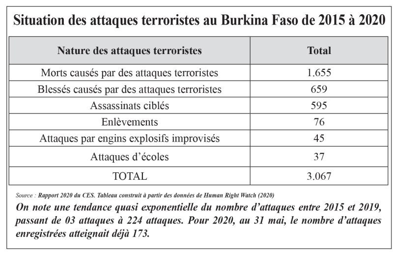 Plus de 800.000 personnes déplacées internes, créant une situation humanitaire inédite, 1.665 personnes tuées, dont 1.229 civils et 436 tués parmi les Forces de défense et de sécurité (FDS) entre janvier 2016 et juillet 2020. Pour la seule année 2020, de janvier à juin, 465 civils et 163 agents des FDS tués, 2 Maires de Communes tués et 3 portés disparus, plusieurs Conseillers municipaux tués ou enlevés. Une centaine de Communes où l’administration publique est inexistante et contrainte à quitter les lieux à cause du risque très élevé.
