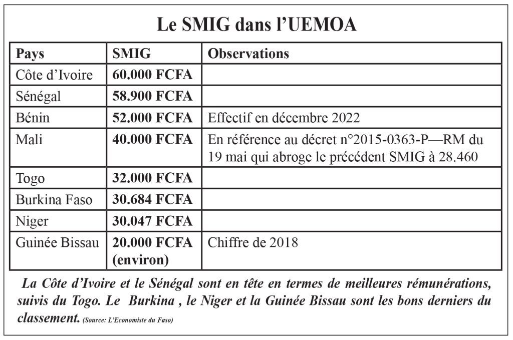 Le principe de l’augmentation du SMIG est une vieille revendication des syndicats, regroupés autour de l’Unité d’action syndicale (UAS). Elle est en bonne voie. Même si les 60.000 FCFA espérés ne sont pas au rendez-vous, cela permettra à une certaine catégorie de travailleurs d’améliorer leur revenu. C’est une avancée majeure au niveau du dialogue social sur ce sujet. En principe, une Commission multipartite qui devrait être mise en place suite au décret N°2010-809/PRES/PM/MTSS/MEF du 31 décembre 2010 portant création, composition, attribution et fonctionnement d’une Commission nationale du salaire minimum interprofessionnel garanti (SMIG) devrait se réunir périodiquement et, à l’aune de la situation socioéconomique nationale, proposer une augmentation ou pas du SMIG. Cette Commission n’a jamais été mise en place. Et il faut saluer le passage en force actuel du gouvernement sur ce point. Il restera maintenant à la mettre en place pour en disposer pour l’avenir. La perspective de relèvement du SMIG pourrait changer le classement du Burkina au niveau des pays membres de l’UEMOA où il était au bas du tableau.o