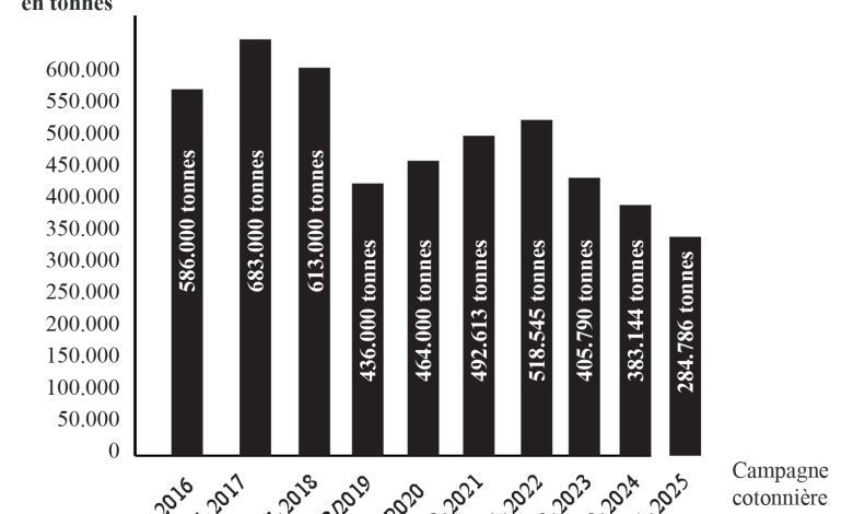 Avec une production totale de 284 786, la campagne 2024-2025 est la moins bonne des dix dernières années. Le gouvernement a pris des mesures pour renverser la tendance au titre de la campagne cotonnière 2025-2026. Ainsi en est-il de l’objectif de production de coton graine conventionnel, fixé à 550 000 tonnes et celui du coton biologique à 1 700 tonnes.